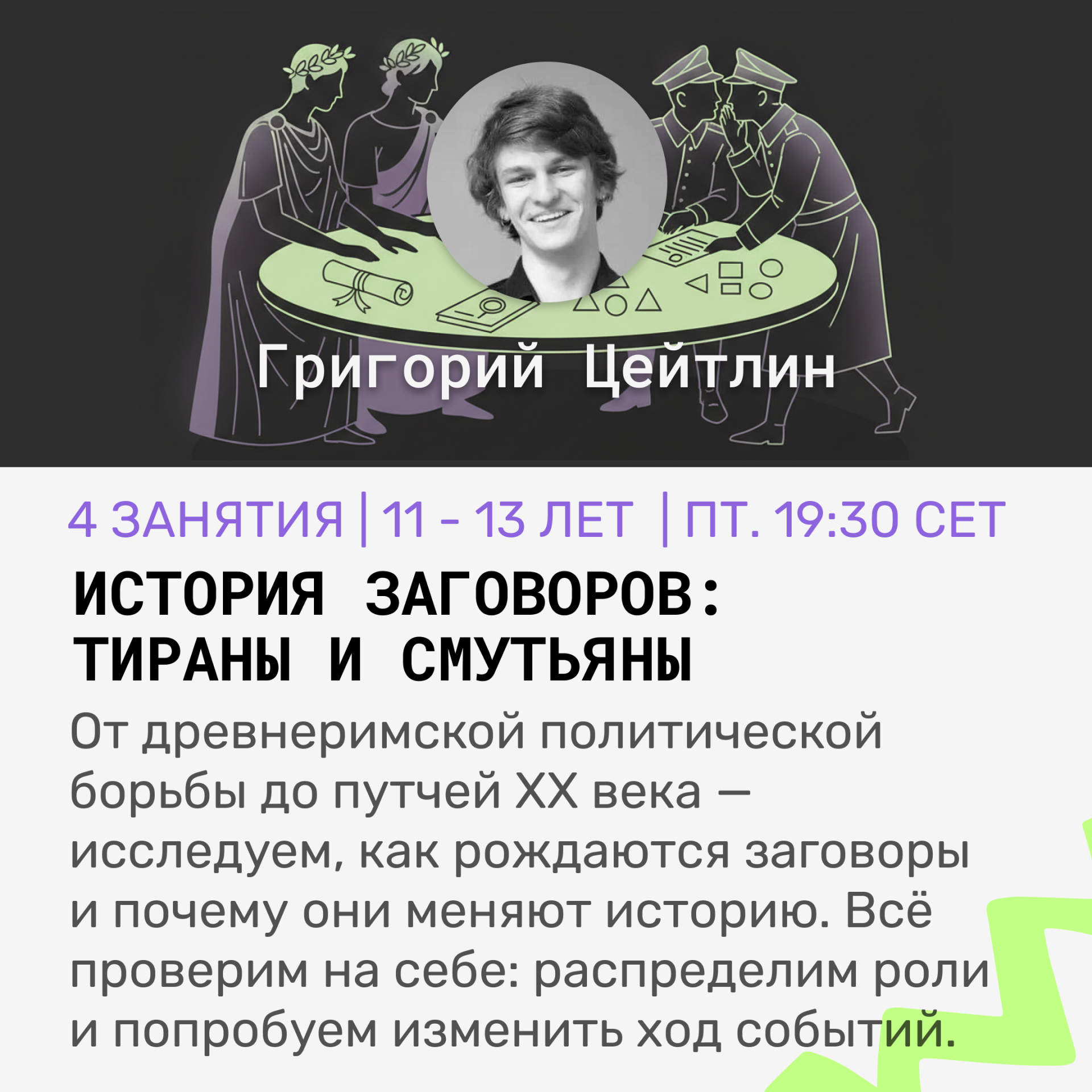Наш курс — на стыке культурологии, риторики и сторителлинга. Изучаем, как менялось общество от античности до наших дней. Анализируя мифы, литературу и комиксы, учимся читать культурные коды и рассказывать истории героев так, чтобы их хотелось слушать.